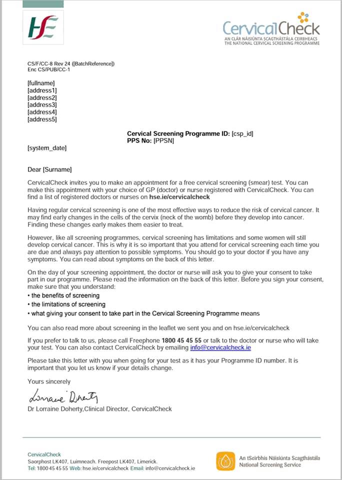 愛爾蘭衞生服務部門 ( HSE ) 會為年滿 25 至 65 歲嘅女性;免費進行子宮頸普查 Cervical Check ( 塗片檢查 Formerly Smear Test ) 。
